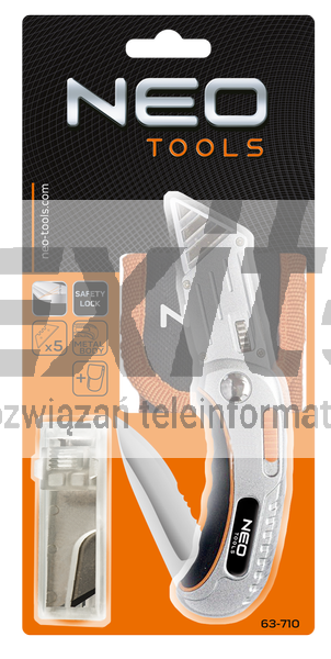 Nóż uniwersalny składany NEO jest wyposażeniem podstawowym dla majsterkowicza, jak i profesjonalistów. To innowacyjne narzędzie jest połączeniem noża trapezowego oraz monterskiego. Uchwyt dwumateriałowy gwarantuje komfort i bezpieczeństwo podczas pracy. Spust zabezpiecza ostrze przed nieoczekiwanym zamknięciem. Specjalny pokrowiec z wytrzymałego nylonu ułatwia transport i przechowywanie.