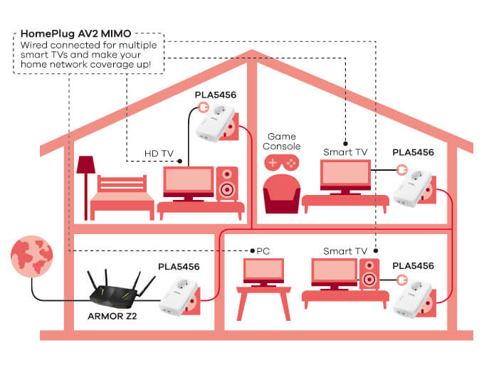 Wyposażony w najnowszą technologię HomePlug AV2 i MIMO, adapter Zyxel PLA5456 oferuje taką samą wydajność jakby był bezpośrednio podłączony do rutera.