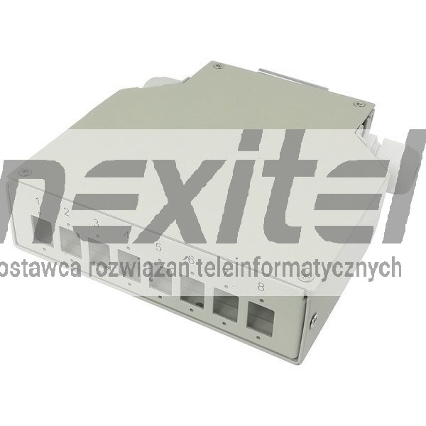Przełącznica światłowodowa, przeznaczona do montażu na szynie w standardzie DIN (TH35, TS35, DIN-3), umożliwiająca zamontowanie do 8 adapterów SC simplex. Konstrukcja pozwala na zakańczanie kabli wewnętrznych i uniwersalnych.