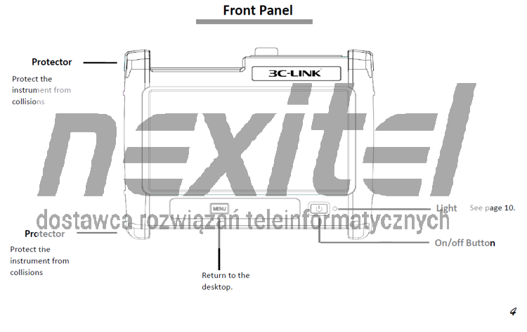 - W pełni wyposażony w VFL, źródło światła, widok liniowy, widok łącza światłowodowego, OPM, test online PON 、 WORKER 、 SEEKER OPM i detektor powierzchni czołowej światłowodu jako opcja
