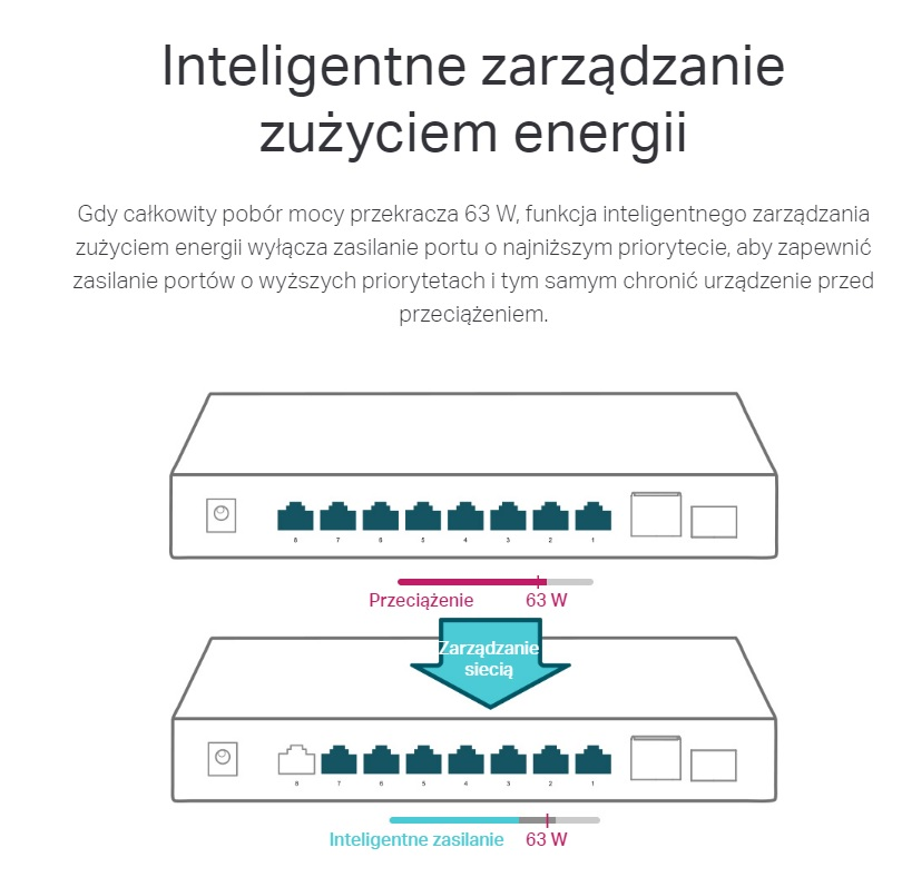 - Budżet mocy PoE do 30 W na każdy port, dla wszystkich portów wartość ta wynosi 63 W.