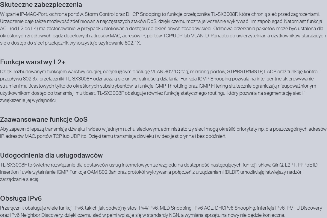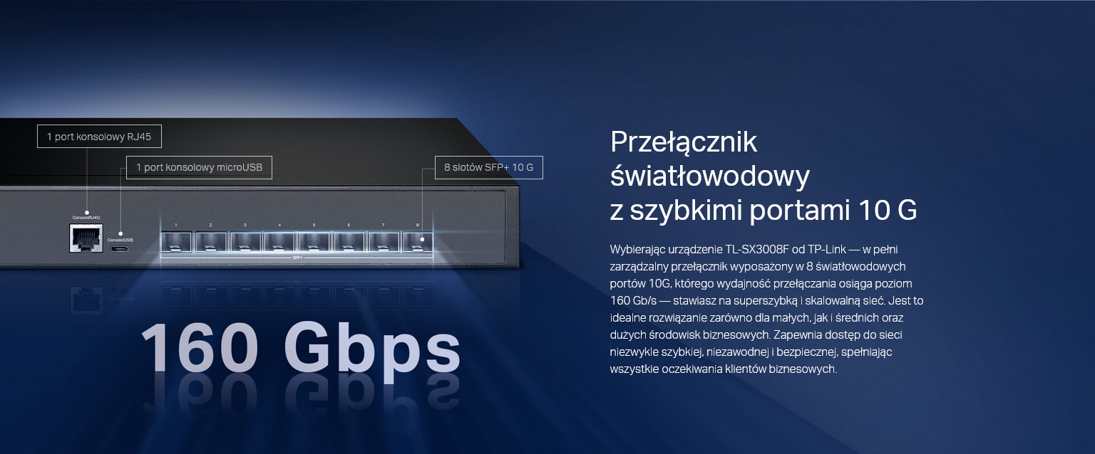 -Urządzenie posiada 8 portów, które zapewniają łączna przepustowość oraz wydajność do 160 Gb/s w trybie non-blocking