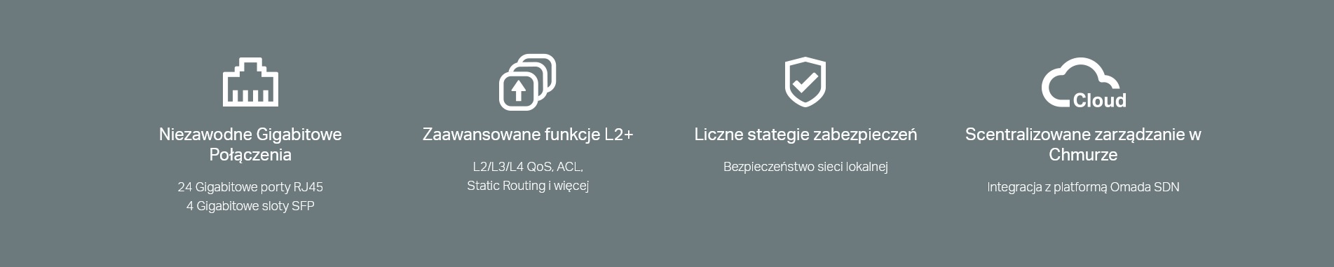 -Urządzenie posiada 24 porty gigabitowe RJ45 i 4 gigabitowe sloty SFP, które zapewniają bardzo wysokie prędkości połączeń