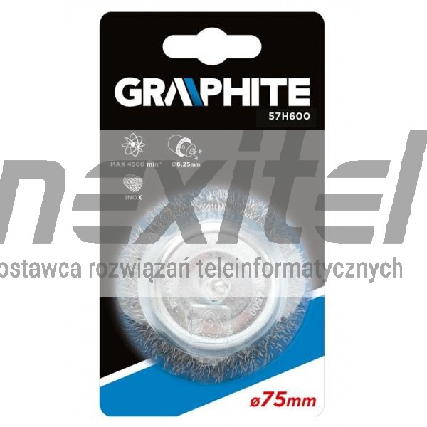 Szczotka druciana o średnicy 75 mm, wykonana z drutu ze stali nierdzewnej o grubości 0.5 mm. Wzmocniona konstrukcja korpusu pozwala na wydajne czyszczenie konstrukcji stalowych ze stali nierdzewnej i stali kwasoodpornej. Mocowanie przystosowane do współpracy z wiertarkami.