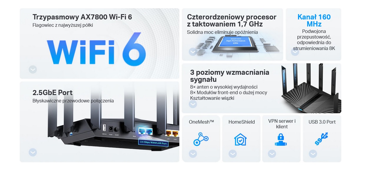-Trzypasmowy, ośmio-strumieniowy router Wi-Fi 6 AX7800