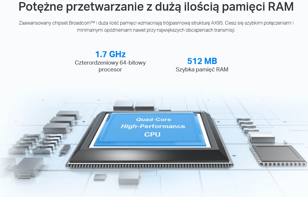 -Urządzenie oferuje duże prędkości w trzech pasmach 4804 Mb/s (5GHz) + 2402 Mb/s (5GHz) + 574 Mb/s (2,4GHz)