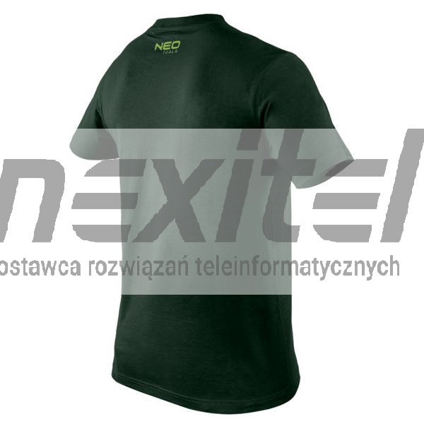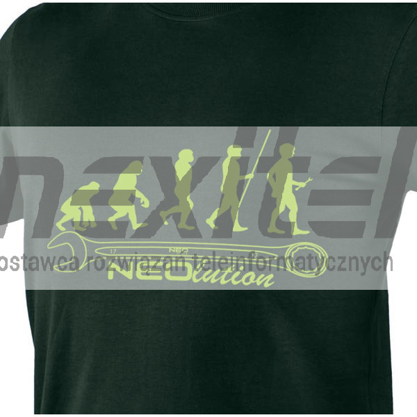 T-shirt roboczy, w kolorze butelkowej zieleni z grafiką NEOlution. Neonowo-zielony nadruk na torsie.