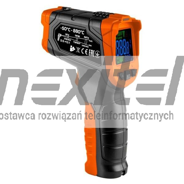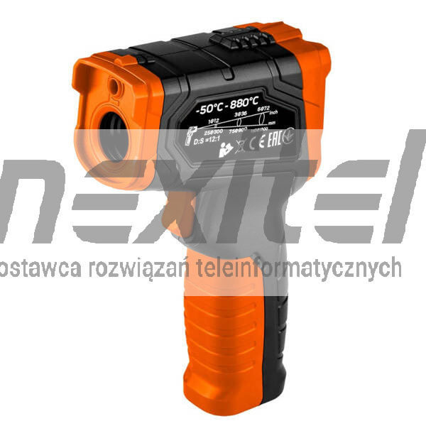 Przyrząd służący do bezdotykowego pomiaru temperatury powierzchni różnych przedmiotów w zakresie temperatur od -50 do +880 stopni Celsjusza z dokładnością do +/- 1,5%. Idealnie sprawdza się w budownictwie, w branży przemysłowej czy spożywczej. Posiada opcję samodzielnego wyłączania. W zestawie dołączone baterie AAA. Urządzenie NIE jest wyrobem medycznym.